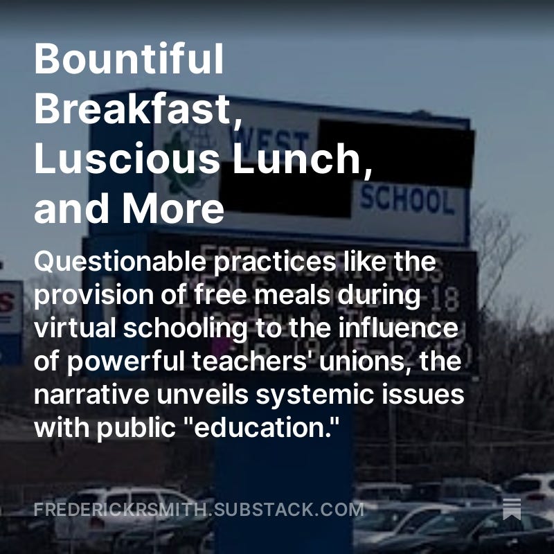 While enjoying lunch at a restaurant with a cogent-minded friend, he (no pronouns necessary) lamented about the state of his public school district and the food situation. With two teen boys in the local public school, he informed me about the status of the cafeteria. Much to my dismay, even when the school was in 100% virtual mode during the COVID Power Play [TM], cafeteria workers remained to prepare food while the teachers stayed home. The fact that these workers prepared breakfast took me off guard. My buddy said, “Fred Smith, you live under a rock; it is common knowledge that the school system provides free breakfast and lunch.” The following data burst sent me into orbit, choking on my food upon hearing the above astonishing news.