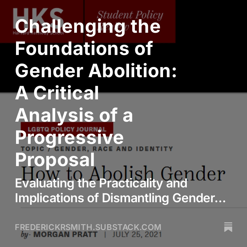 Morgan Pratt’s 2021 Harvard Kennedy School paper How to Abolish Gender offers a bold “plan.” It aims to dismantle “gender hierarchies” by reforming societal structures through policy changes. Pratt’s call to abolish gender has flaws, and it oversimplifies complex issues. It makes impractical assumptions but may also have harmful effects. While pursuing ending oppressive roles is a worthy goal, his argument is a flawed screed. This essay will examine flaws in Pratt’s proposal. It will expose the dystopian notion of achieving a “genderless society,” focusing on the suggested “reforms.” This essay will challenge the belief that a dystopian policy can change deep-seated social, cultural, and biological factors. It will explore other ways to achieve gender equality. These methods should respect individual identity and freedom without erasing gender/sex.