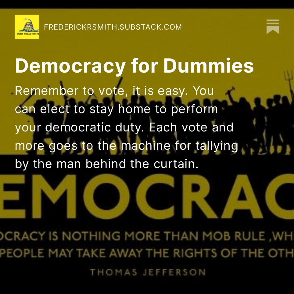 Remember to vote, it is easy. You can elect to stay home to perform your democratic duty. Each vote and more goes to the machine for tallying by the man behind the curtain. It is for the common good of democracy. And there is plenty of swamp land for sale in Texas.