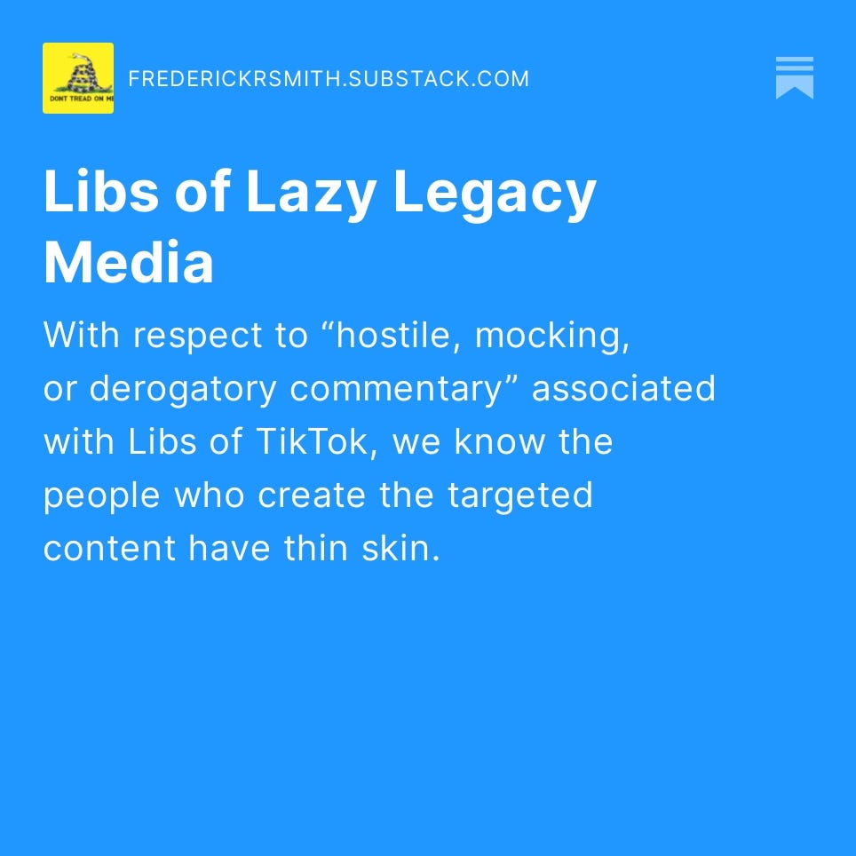 Concerning “hostile, mocking, or derogatory commentary” associated with Libs of TikTok, we know the people who create the targeted content have thin skin. They are unwitting subjects of the grand scheme to transform the population. I feel sorry for them. The snowflake’s feelings are hurt. There, I said it.
