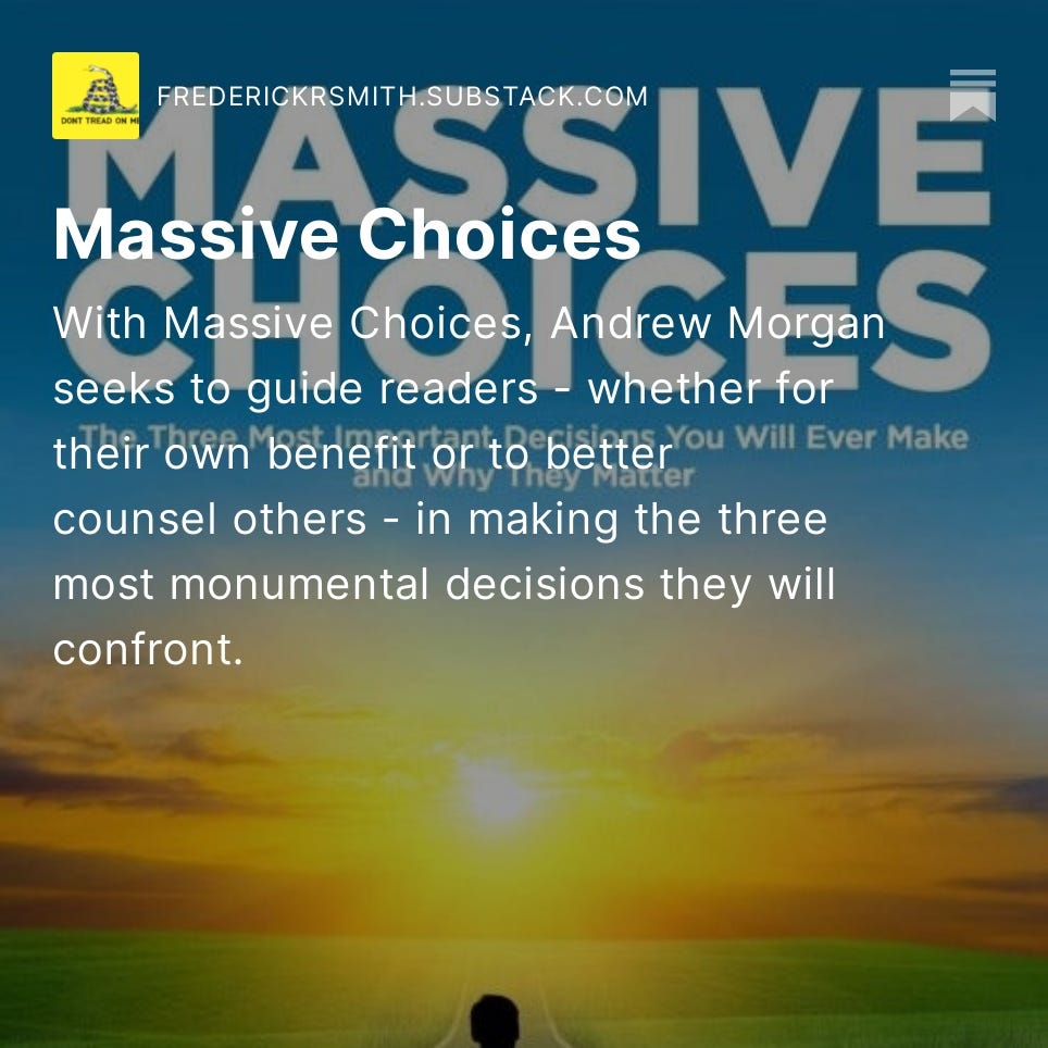 Since Cheval’s last guest post at Frederick R. Smith Speakes, hundreds of new subscribers have come aboard the “Speakes Train of Thought.” Perhaps more recent subscribers might want to check out the above essays. Coincidently, Cheval told me he has been off the radar because he has been writing a book. It was published on August 15, 2023. Thus, it is an honor and privilege to reveal the identity of Cheval (as he desired) and review his book, Massive Choices: The Three Most Important Decisions You Will Ever Make and Why They Matter.