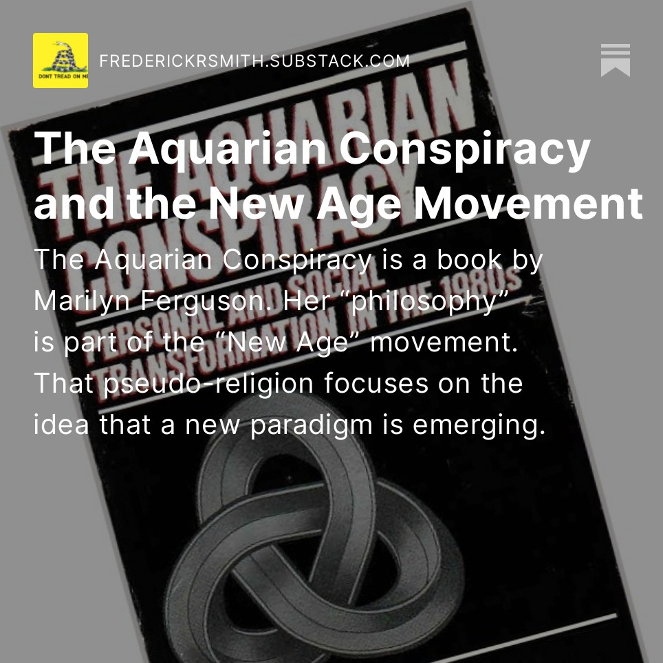 The Aquarian Conspiracy is a book by Marilyn Ferguson. Her “philosophy” is part of the “New Age” movement. That pseudo-religion focuses on the idea that a new paradigm is emerging.