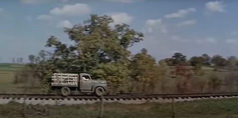 The duo seize the opportunity and decide to make their escape using a different vehicle—Powell’s 1948 Ford pickup truck. With the cigar-smoking sheriff and Meshaw hot on their trail, they speed away in the stolen truck. Their path ends as they reach a dead end—a dirt road ending at a railroad track. Mordecai instructs Curley to deflate the truck’s tires to half pressure, a cunning move to hug the rails and maximize traction. Wedging the pickup truck onto the rails, they embark on a daring escape, utilizing the tracks as their makeshift path.