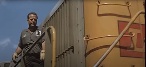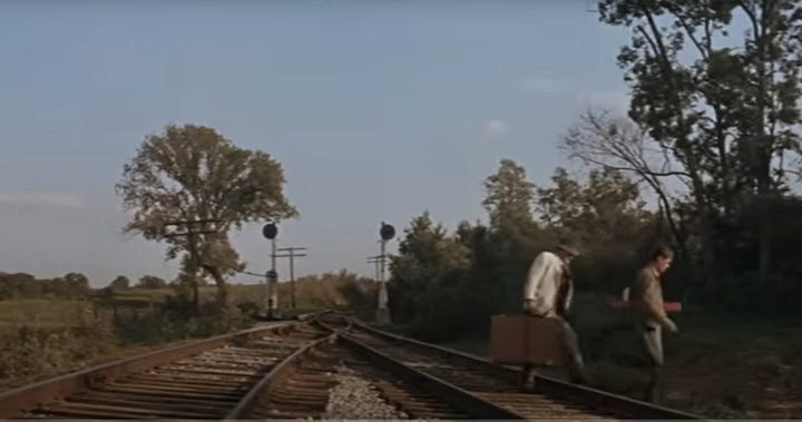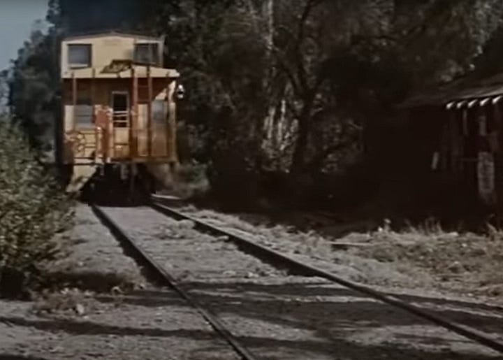 As Mordecai stands at the crossing, a freight train rumbles by, positioned between him and the camera. The passing train symbolizes the transient nature of his life, always on the move and never rooted in one place for too long. It echoes the themes of freedom, adventure, and constant change throughout the film.