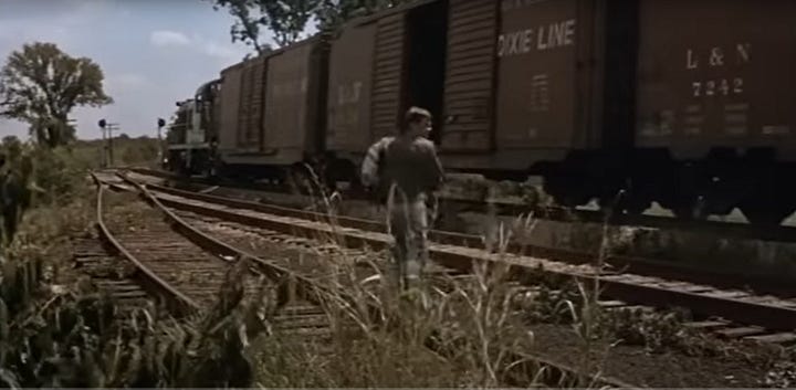 Curley, a character running from the authorities, finds himself next to a passing Louisville & Nashville Railroad freight train. A sudden occurrence catches his attention as he prepares to swing himself into a boxcar of a moving train. A man and his suitcase in a scuffle get expelled from the boxcar ahead of him. In this initial glimpse into Curley’s compassionate nature, he foregoes boarding the train. He jumps off the train’s side to aid the older man, Mordecai Jones.