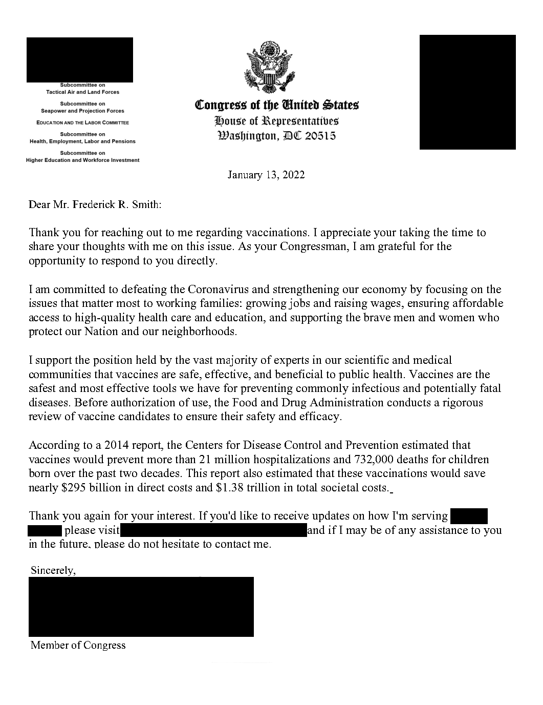 Below is the text of a letter Your Author sent to his congressional representative on September 3, 2021, concerning vaccine labeling. The Congressman’s January 13, 2022, response letter follows.
